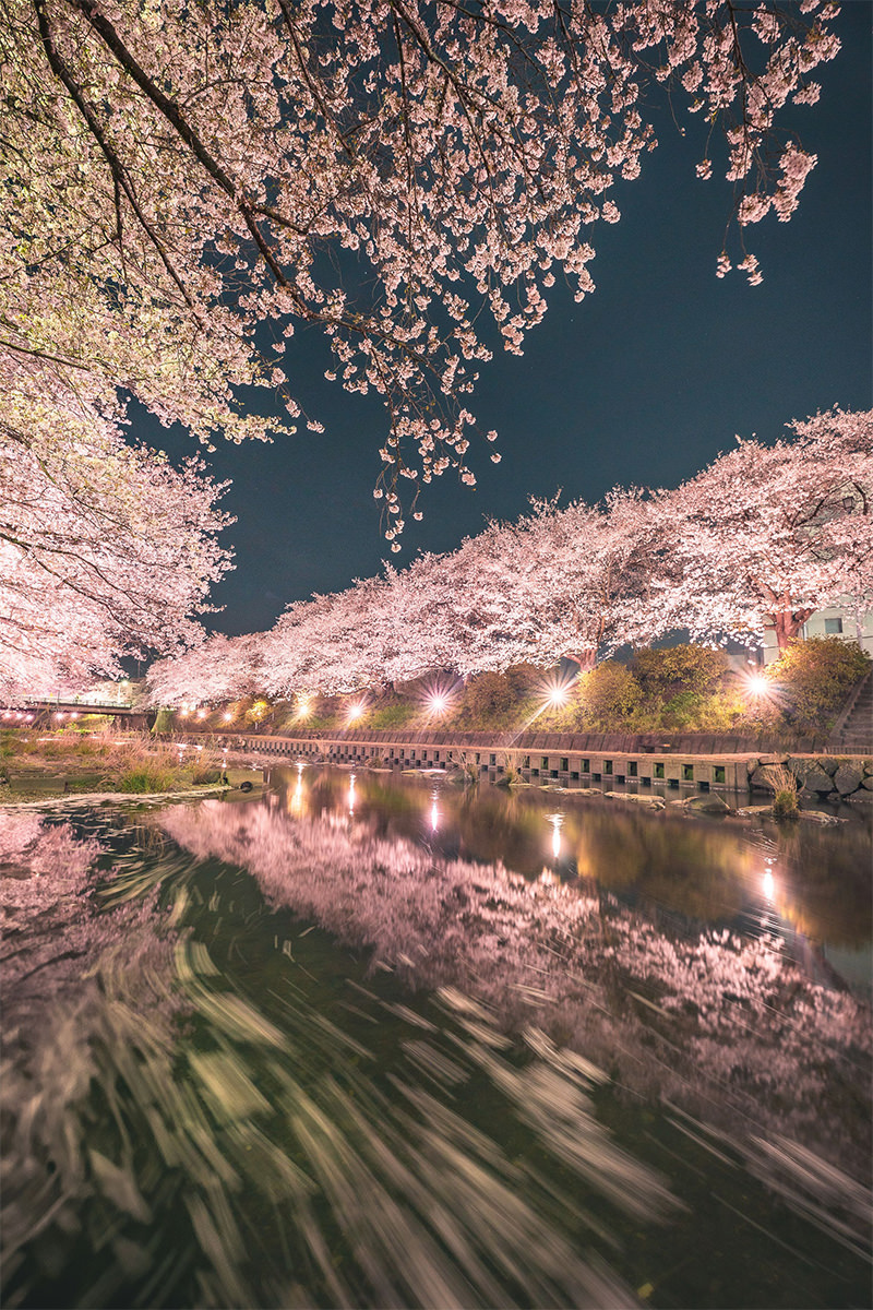 とても素敵な夜桜ですね。川を流れる花筏が見事に描かれています。夜、桜、花筏という組み合わせはなかなか撮れそうで撮れないものです。スローシャッターにする必要があるため風が吹いていたらダメ出し桜は散り始めていないとダメ、そして水が流れていないとダメ、というタイミングを見事に作品に仕上げています。そして真夜中になってしまう少し前のブルーモーメントの時間帯に撮影することで桜の色が表現されています。