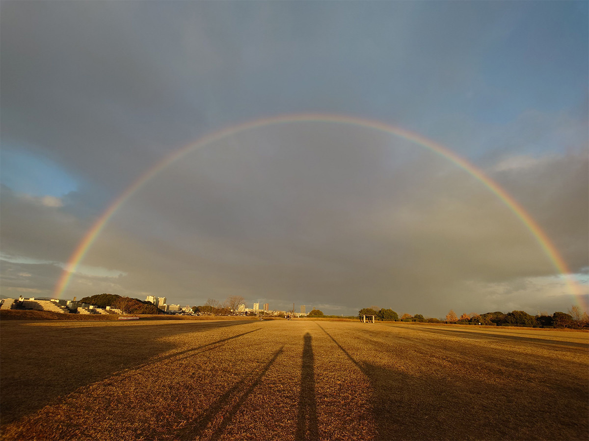 虹。私も普段の生活で虹を見かける時は、必ずと言っていいほどスマホで撮影します。まあ本業のカメラを持っていれば良いのですが、撮影していない時に限って素晴らしい虹に出逢う物です。しかも撮影された虹は見事な半円を描いています。恐らく夕刻なのでしょう。虹が出た!!っと思わず撮影されたお気持ちが伝わって来るようです。太陽が低くなればなるほど高い虹が見られます。また良くダブルレーンボーと言われていますが、基本的に虹はダブルで出ているのです。外側が薄くて見えないだけで物理的には出てるんですね。この写真もよく見ると外側にもう1本見えますよね。